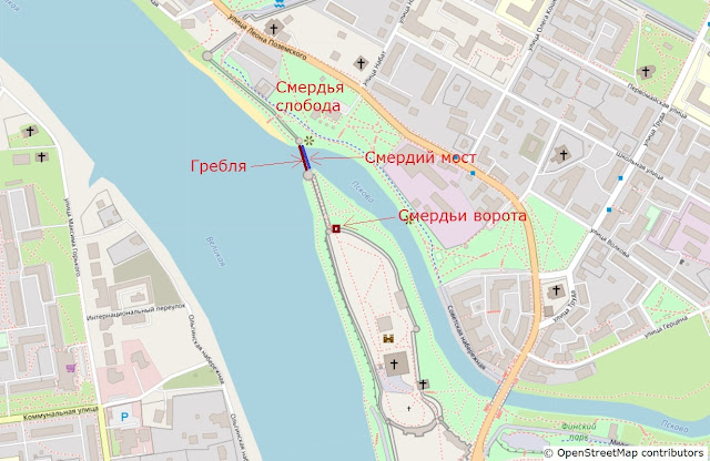 | Гребля, Смердьи ворота, Смердий мост по современным представлениям. (Схема составлена на с использованием карты с сайта © OpenStreetMap contributors). |
